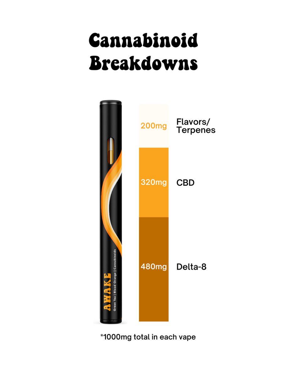 Awake pairs the citrusy flavor of blood orange, the freshness of green tea, and a nearly equal combination of CBD and Delta-8 THC. Pair this blend with running errands or exploring.