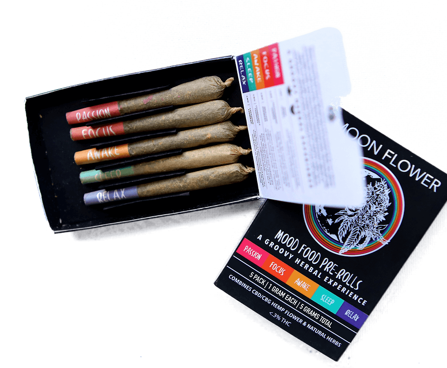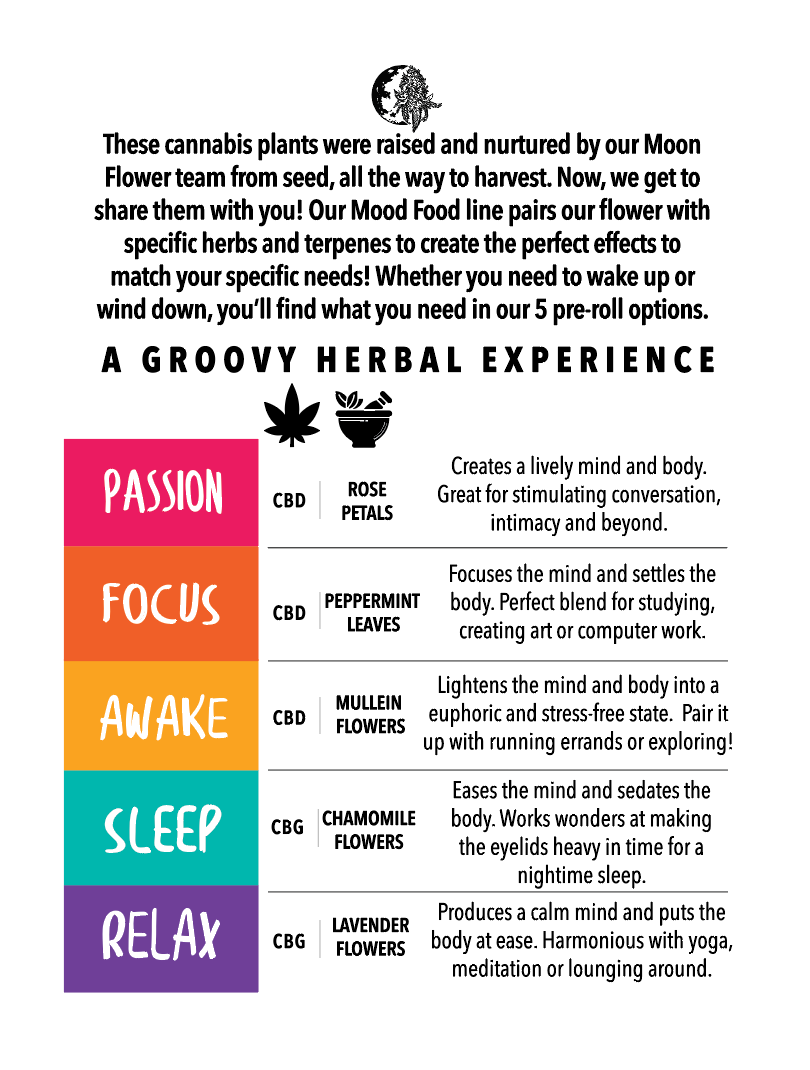 Our Mood Food pre-roll line pairs our flower with specific herbs and terpenes. Each pack contains 5, 1g pre-rolls- totaling 5 grams per box. CHOOSE YOUR 5 PREFERED PREROLLS